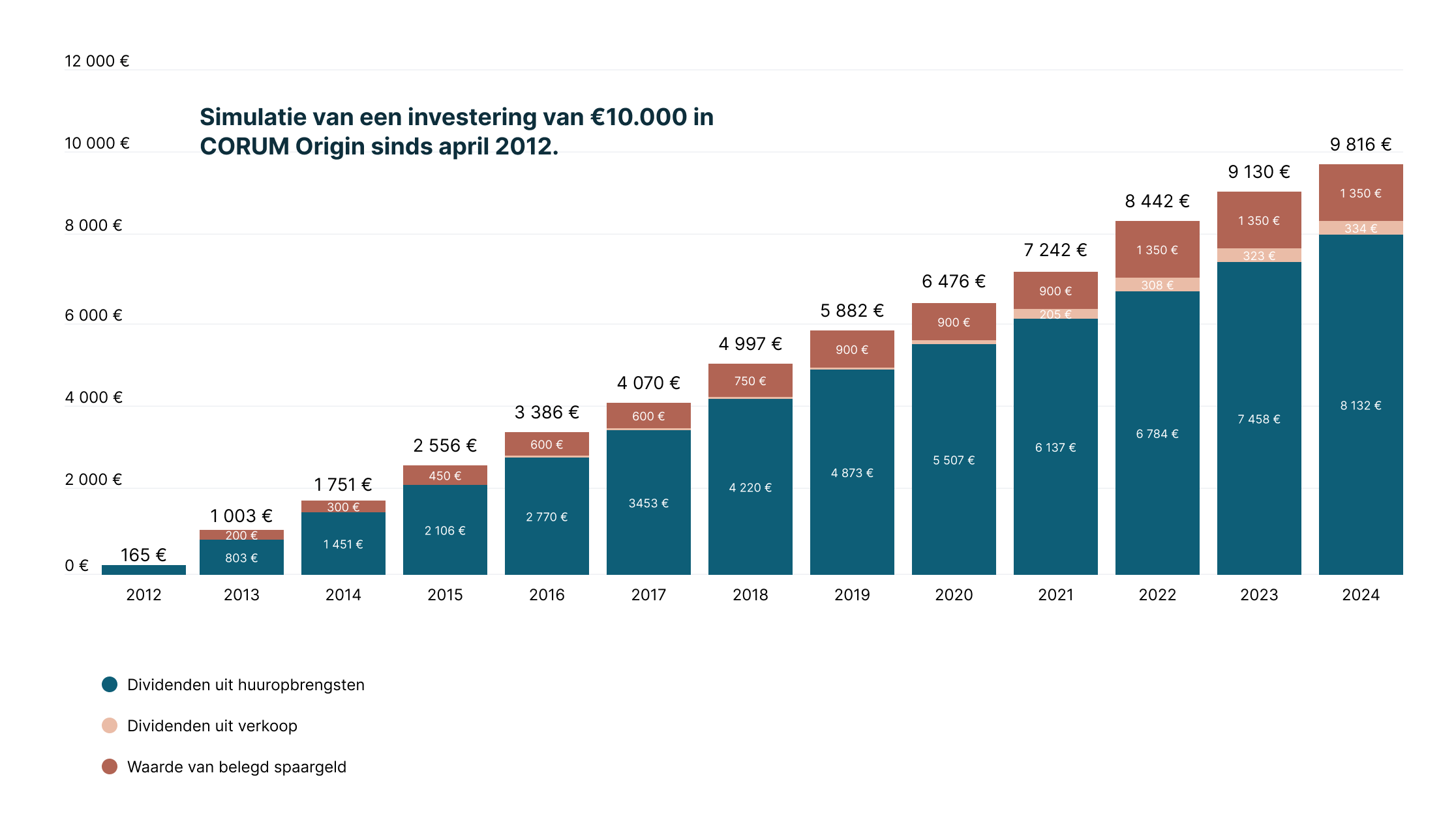 Deze drie mechanismen kunnen na verloop van tijd aanzienlijke toegevoegde waarde creëren. Een investering van 10.000 euro bijvoorbeeld, die werd gedaan bij de lancering van CORUM Origin in 2012 en sindsdien niet is veranderd, was op 31 december 2024 19.816 euro waard. Dit komt overeen met een winst van bijna 100% (+98,2%) en dus bijna het dubbele van de oorspronkelijke investering (zonder rekening te houden met mogelijke uitgiftepremies bij exit).
